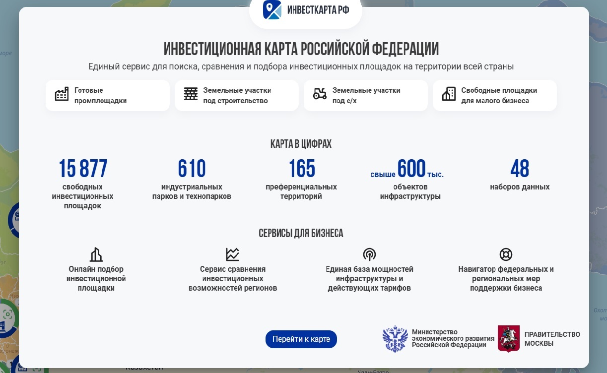 Инвестиционная карта России– это интерактивная платформа, которая предоставляет подробную информацию обо всех инвестиционных возможностях региона. Она включает в себя данные о свободных земельных участках, промышленных зонах, объектах недвижимости, а также о мерах государственной поддержки и налоговых льготах.